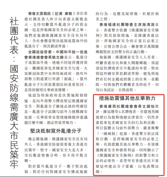 香港廣西社團總會會長文頴怡批 評,羅冠總等 6名潛逃者,在竄逃英國 後便以為能夠逃避法律責任,仍然多 番從事危害國家安全的行為和活動, 明目張膽去勾結外部勢力,嚴重衝擊 「一國兩制」底線。香港警方依法採 取行動,是捍衛國家安全的必要之 舉,有助震懾其他反華勢力,有效維 護國家安全和發展利益,同時顯示了 《維護國家安全條例》的影響力和立 法的必要性,希望所有香港市民不要被這些違法分子蒙蔽,以免誤墮法網。