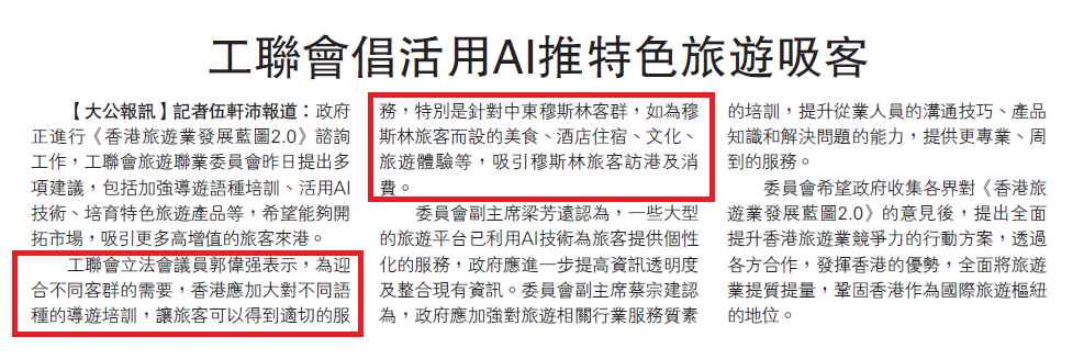 郭偉强 | 大公報 | 工聯會倡活用AI推特色旅遊吸客