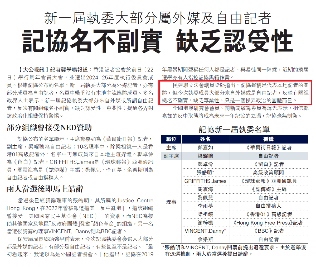 民建聯立法會議員梁熙指出,記協聲稱是代表本地記者的團體,但今次執委成員大部分來自外媒或是自由記者,反映有關組織名不副實,缺乏專業性,只是一個操弄政治的團體而已。