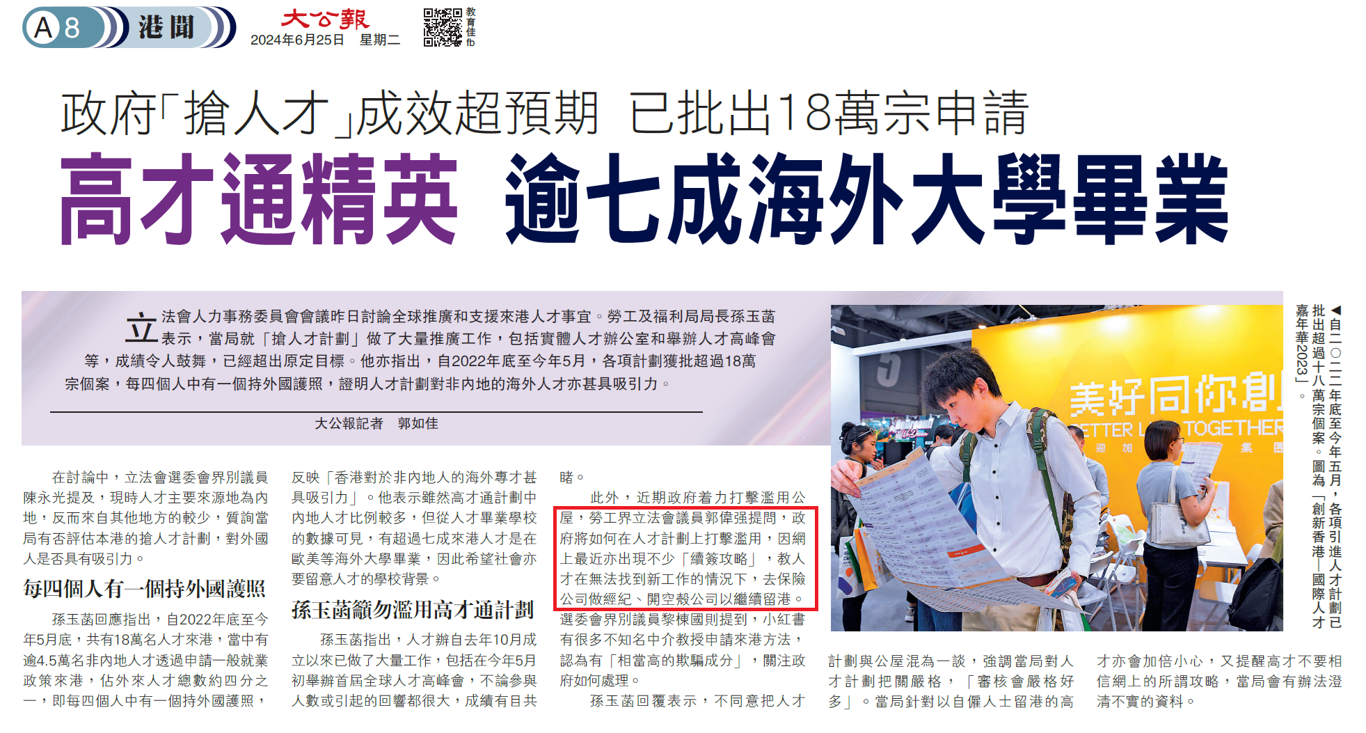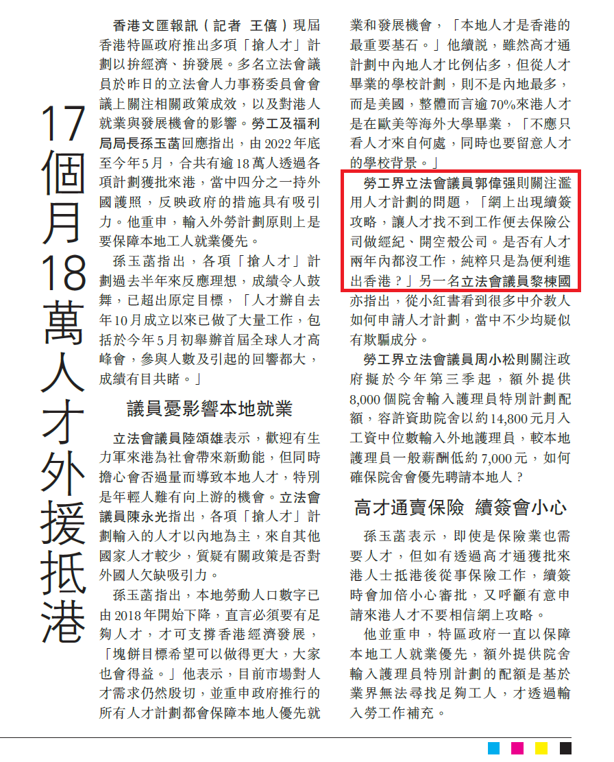 勞工界立法會議員郭偉强則關注濫用人才計劃的問題,「網上出現續簽攻略,讓人才找不到工作便去保險公司做經紀、開空殼公司。是否有人才兩年內都沒工作,純粹只是為便利進出香港?」