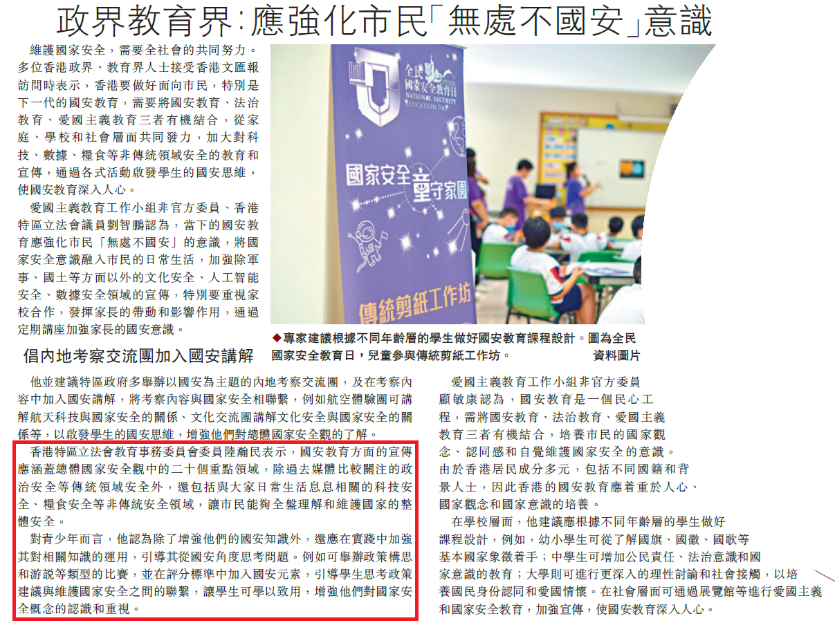香港特區立法會教育事務委員會委員陸瀚民表示,國安教育方面的宣傳應涵蓋總體國家安全觀中的二十個重點領域,除過去媒體比較關注的政治安全等傳統領域安全外,還包括與大家日常生活息息相關的科技安全、糧食安全等非傳統安全領域,讓市民能夠全盤理解和維護國家的整體安全。