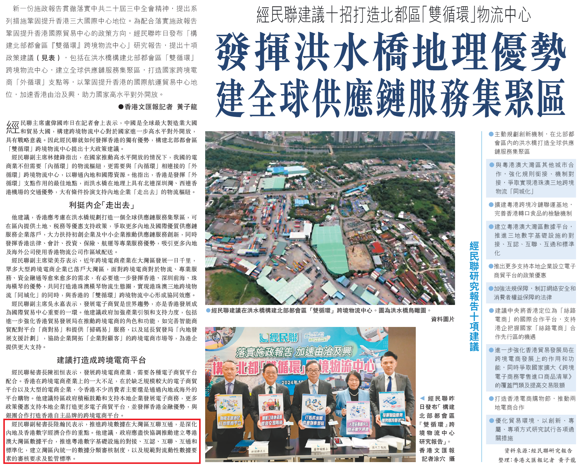 經民聯副秘書長陸瀚民表示,推進跨境數據在大灣區互聯互通,是深化內地及香港數字經濟合作的重點。他建議,政府應盡快協調推動建立粵港澳大灣區數據平台,推進粵港數字基礎設施的對接、互認、互聯、互通和標準化,建立灣區內統一的數據分類審核制度,以及規範對流動性數據要素的審核要求及監管標準。