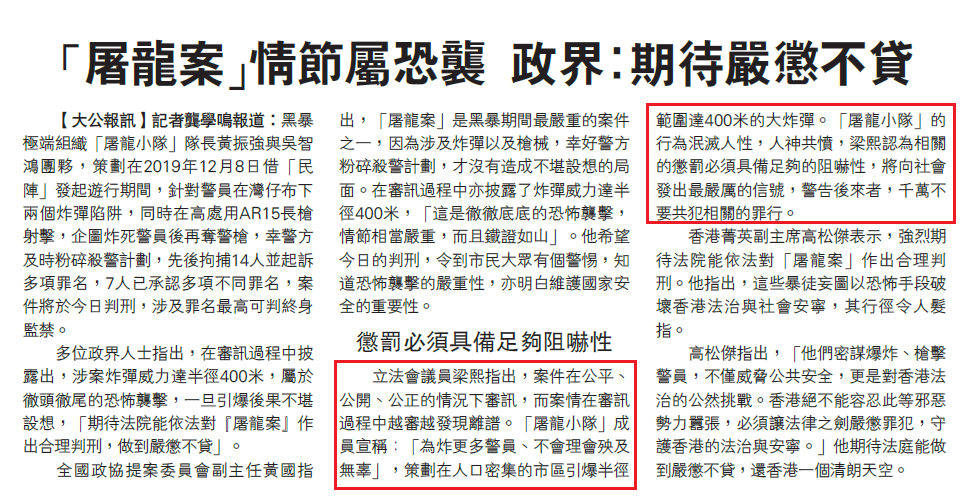 立法會議員梁熙指出,案件在公平、公開、公正的情況下審訊,而案情在審訊過程中越審越發現離譜。「屠龍小隊」成員宣稱:「為炸更多警員、不會理會殃及無辜」,策劃在人口密集的市區引爆半徑範圍達400米的大炸彈。「屠龍小隊」的行為泯滅人性,人神共憤,梁熙認為相關的懲罰必須具備足夠的阻嚇性,將向社會發出最嚴厲的信號,警告後來者,千萬不要共犯相關的罪行。