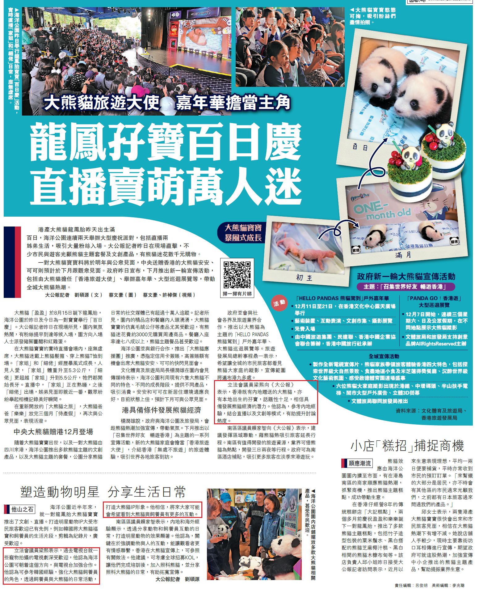 立法會議員梁熙向《大公報》表示,香港既有內地贈送的大熊貓,亦有本地出生的孖寶,話題性十足,相信具備發展熊貓經濟的潛力。他認為,參考內地經驗,結合直播以及文創等模式,有助提升討論熱度。