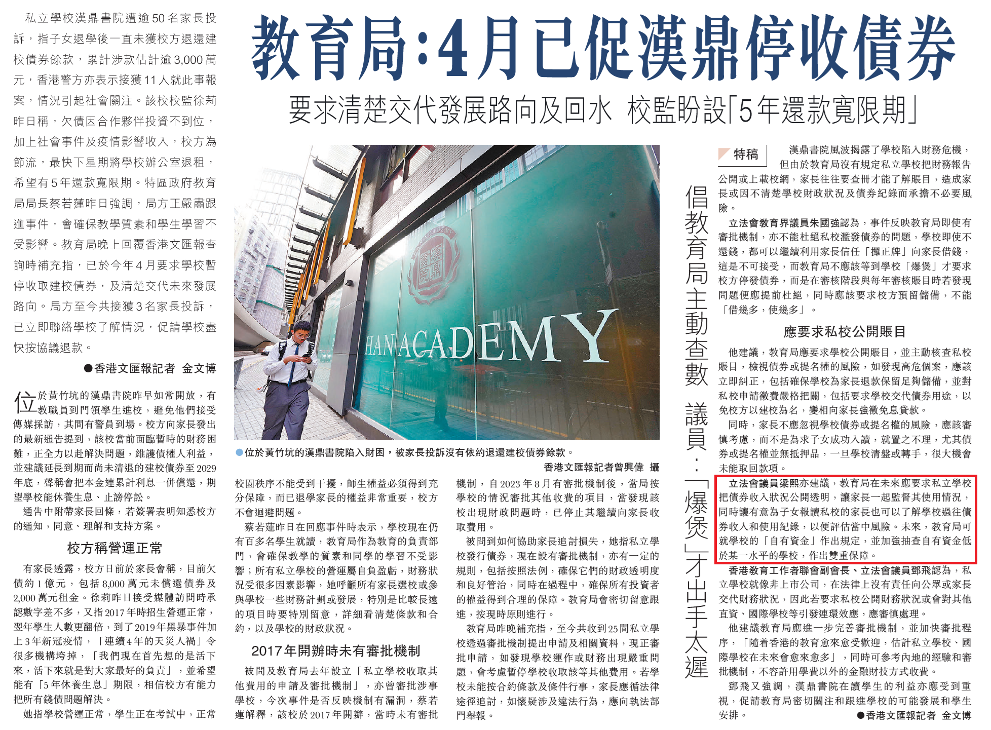 立法會議員梁熙亦建議,教育局在未來應要求私立學校把債券收入狀況公開透明,讓家長一起監督其使用情況,同時讓有意為子女報讀私校的家長也可以了解學校過往債券收入和使用紀錄,以便評估當中風險。未來,教育局可就學校的「自有資金」作出規定,並加強抽查自有資金低於某一水平的學校,作出雙重保障。