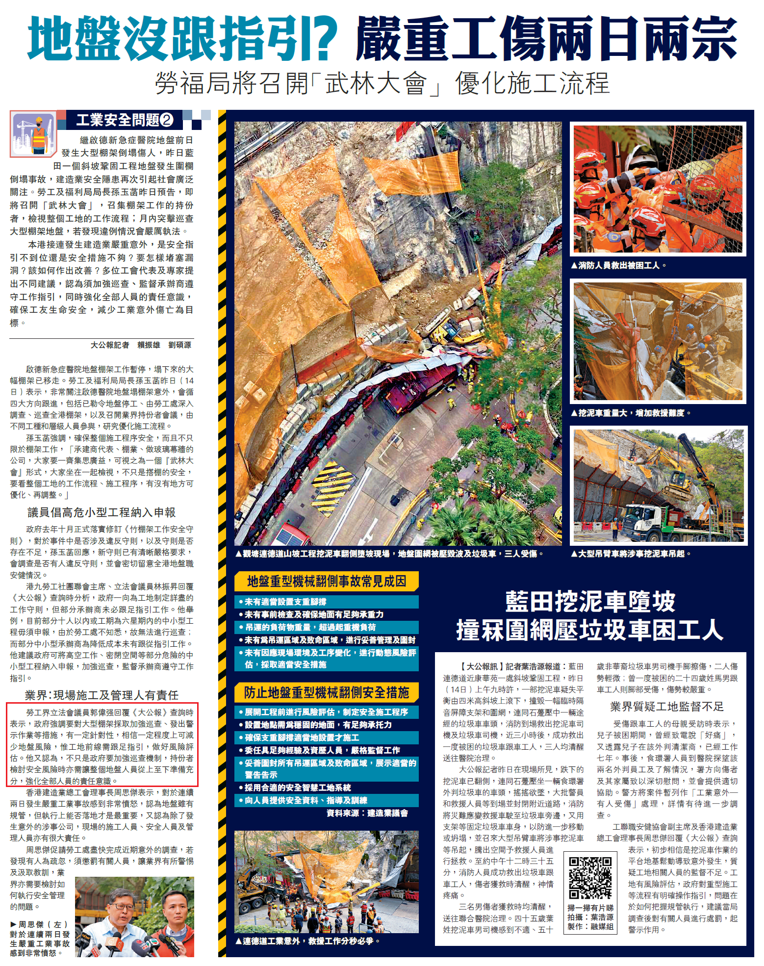 勞工界立法會議員郭偉强回覆《大公報》查詢時表示,政府強調要對大型棚架採取加強巡查、發出警示作業等措施,有一定針對性,相信一定程度上可減少地盤風險,惟工地前線需跟足指引,做好風險評估。他又認為,不只是政府要加強巡查機制,持份者檢討安全風險時亦需讓整個地盤人員從上至下準備充分,強化全部人員的責任意識。