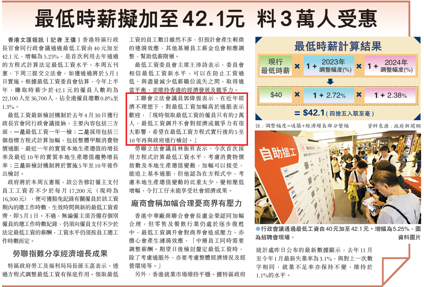 工聯會立法會議員郭偉强接受《大公報》訪問時稱,調整幅度雖然沒什麼驚喜,但採納一年一檢的機制,對基層打工仔有保障,「起碼年年有得加,就算唔加,最多都係凍(薪)。」不過他指出,現時的方程式仍有不足,經濟因素是按最近一年實質本地生產總值增長率(GDP),減最近十年的GDP,再乘20%,意味即使經濟上升,基層也難分享到經濟成果。他認為,當工資升幅出現脫節時,政府要及時修訂方程式。