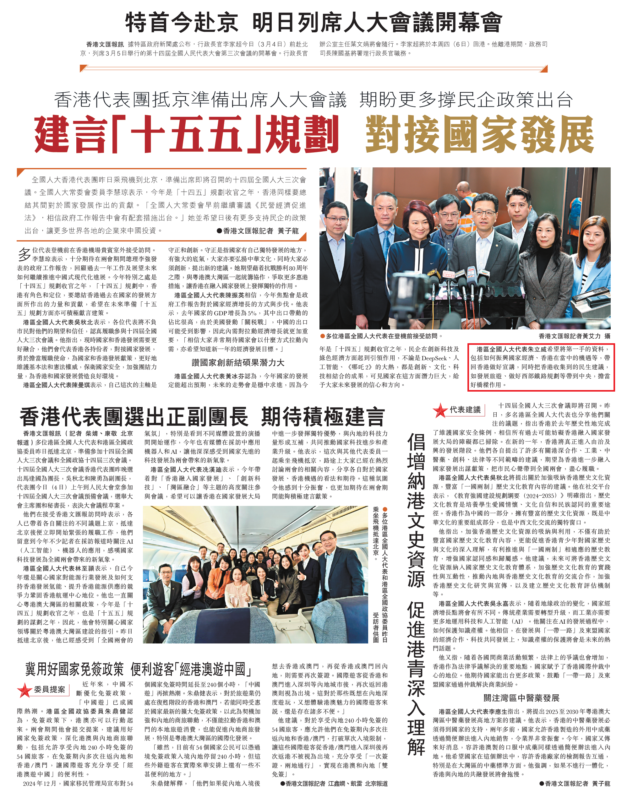 港區全國人大代表朱立威希望將第一手的資料,包括如何振興國家經濟、香港在當中的機遇等,帶回香港做好宣講,同時把香港收集到的民生建議,如發展旅遊、做好西部鐵路規劃等帶到中央,擔當好橋樑作用。