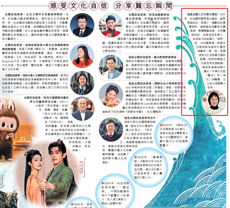 港區全國人大代表文頴怡:2023年,在法國阿爾卑斯山脈的一處雪場酒店內,度過了一個難忘的農曆新年。當時酒店為慶祝中國春節,舉辦舞獅表演,令我驚訝的是,表演者並非華人,而是高大的法國人。他們一招一式充滿熱情,現場中外遊客都為這份中國年味歡呼。那一刻,我感受到文化自信最生動的詮釋:我們的傳統文化被世界自發接納,還成為當地的節日儀式。中華文化從「輸出」到「吸引」的轉變,正以多元姿態融入世界。