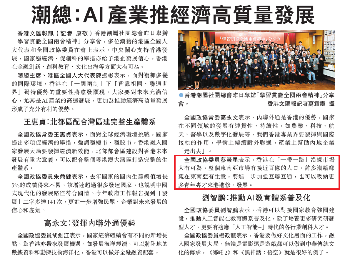 全國政協委員蔡榮星表示,香港在「一帶一路」沿線市場大有可為,整個東南亞市場有接近百億的人口,許多潮籍鄉親在東南亞有生意,要進一步加強互聯互通,也可以吸納更多青年專才來港進修、發展。