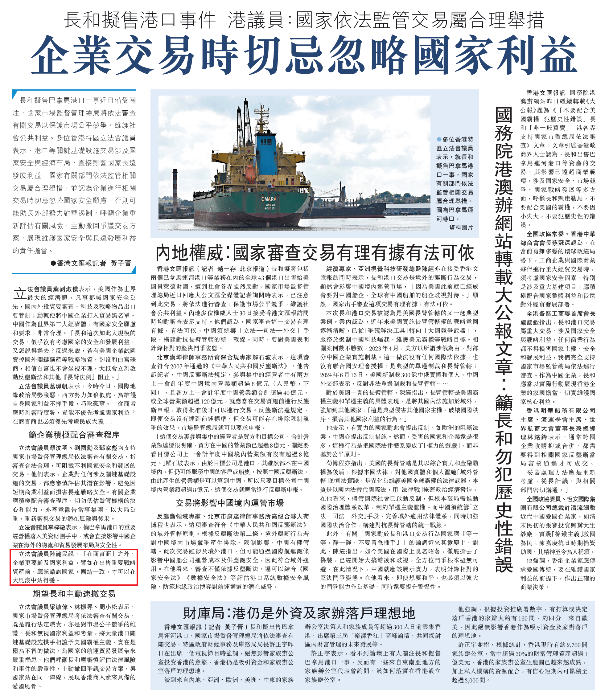 立法會議員陸瀚民說,「在商言商」之外,企業更要顧及國家利益,譬如在出售重要戰略資產前,應該諮詢國家,團結一致,才可以在大風浪中站得穩。