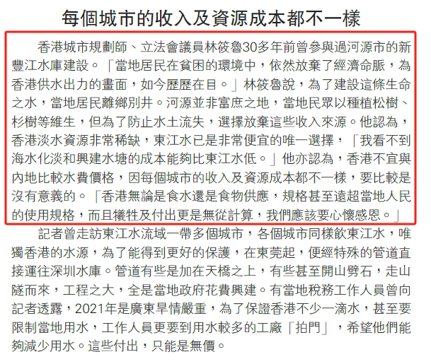 香港城市規劃師、立法會議員林筱魯30多年前曾參與過河源市的新豐江水庫建設。「當地居民在貧困的環境中,依然放棄了經濟命脈,為香港供水出力的畫面,如今歷歷在目。」林筱魯說,為了建設這條生命之水,當地居民離鄉別井。河源並非富庶之地,當地民眾以種植松樹、杉樹等維生,但為了防止水土流失,選擇放棄這些收入來源。他認為,香港淡水資源非常稀缺,東江水已是非常便宜的唯一選擇, 「我看不到海水化淡和興建水塘的成本能夠比東江水低。」他亦認為,香港不宜與內地比較水費價格,因每個城市的收入及資源成本都不一樣,要比較是沒有意義的。「香港無論是食水還是食物供應,規格甚至遠超當地人民的使用規格,而且犧牲及付出更是無從計算,我們應該要心懷感恩。」