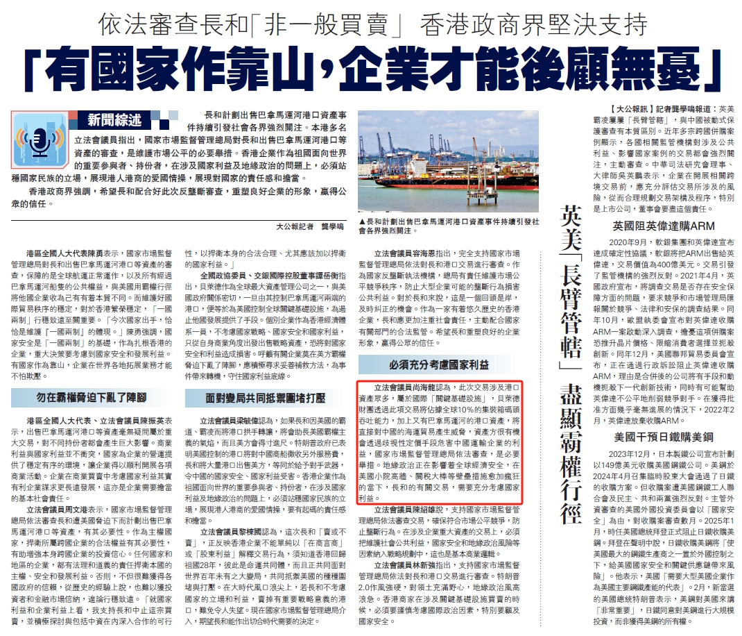 立法會議員尚海龍認為,此次交易涉及港口資產眾多,屬於國際「關鍵基礎設施」,貝萊德財團透過此項交易將佔據全球10%的集裝箱碼頭吞吐能力,加上又有巴拿馬運河的港口資產,將直接對中國的海運貿易產生威脅,資產方很有機會透過歧視性定價手段危害中國運輸企業的利益,國家市場監督管理總局依法審查,是必要舉措。地緣政治正在影響着全球經濟安全,在美國小院高牆、關稅大棒等壁壘措施愈加瘋狂的當下,長和的有關交易,需要充分考慮國家利益。