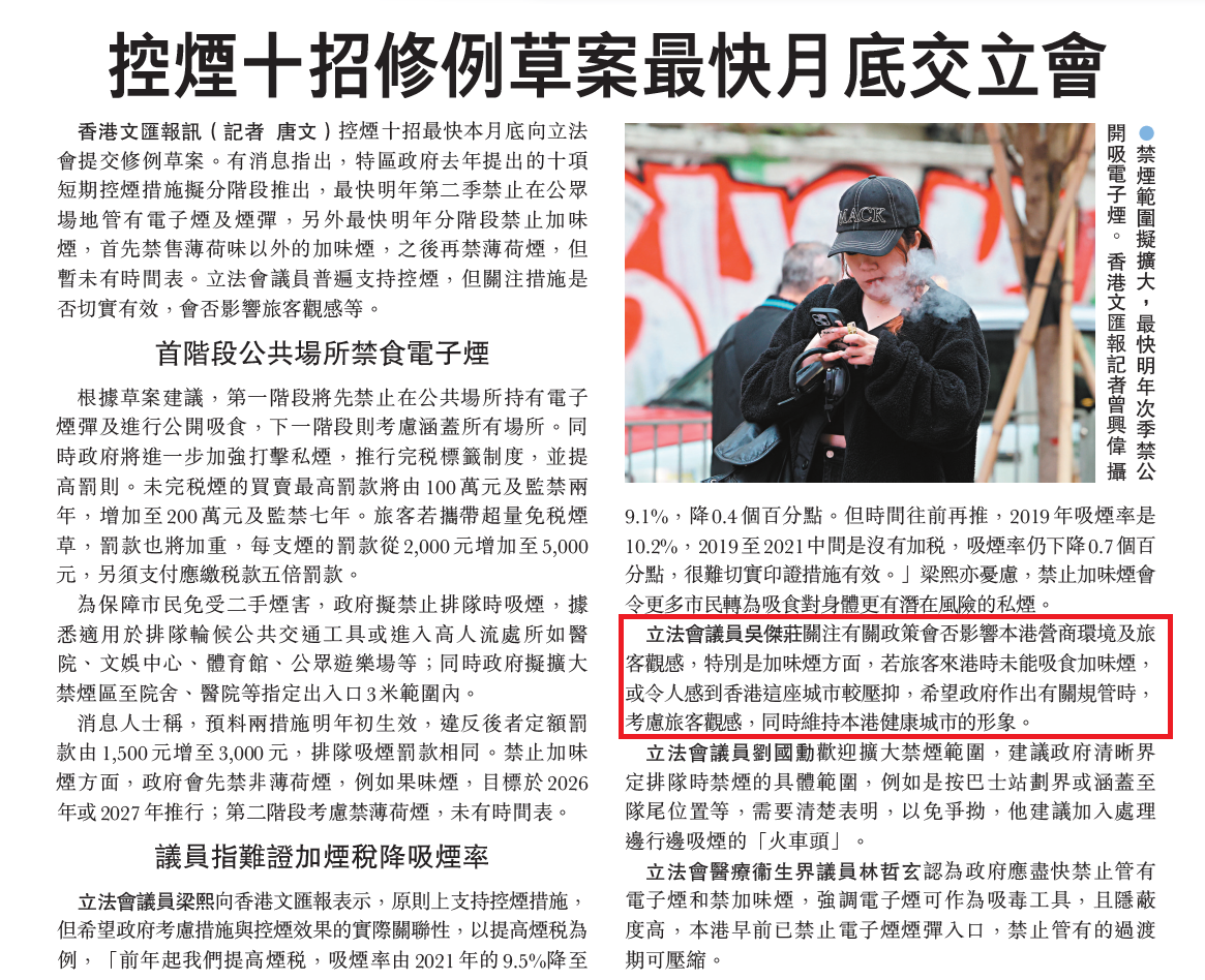 立法會議員吳傑莊關注有關政策會否影響本港營商環境及旅客觀感,特別是加味煙方面,若旅客來港時未能吸食加味煙,或令人感到香港這座城市較壓抑,希望政府作出有關規管時,考慮旅客觀感,同時維持本港健康城市的形象。