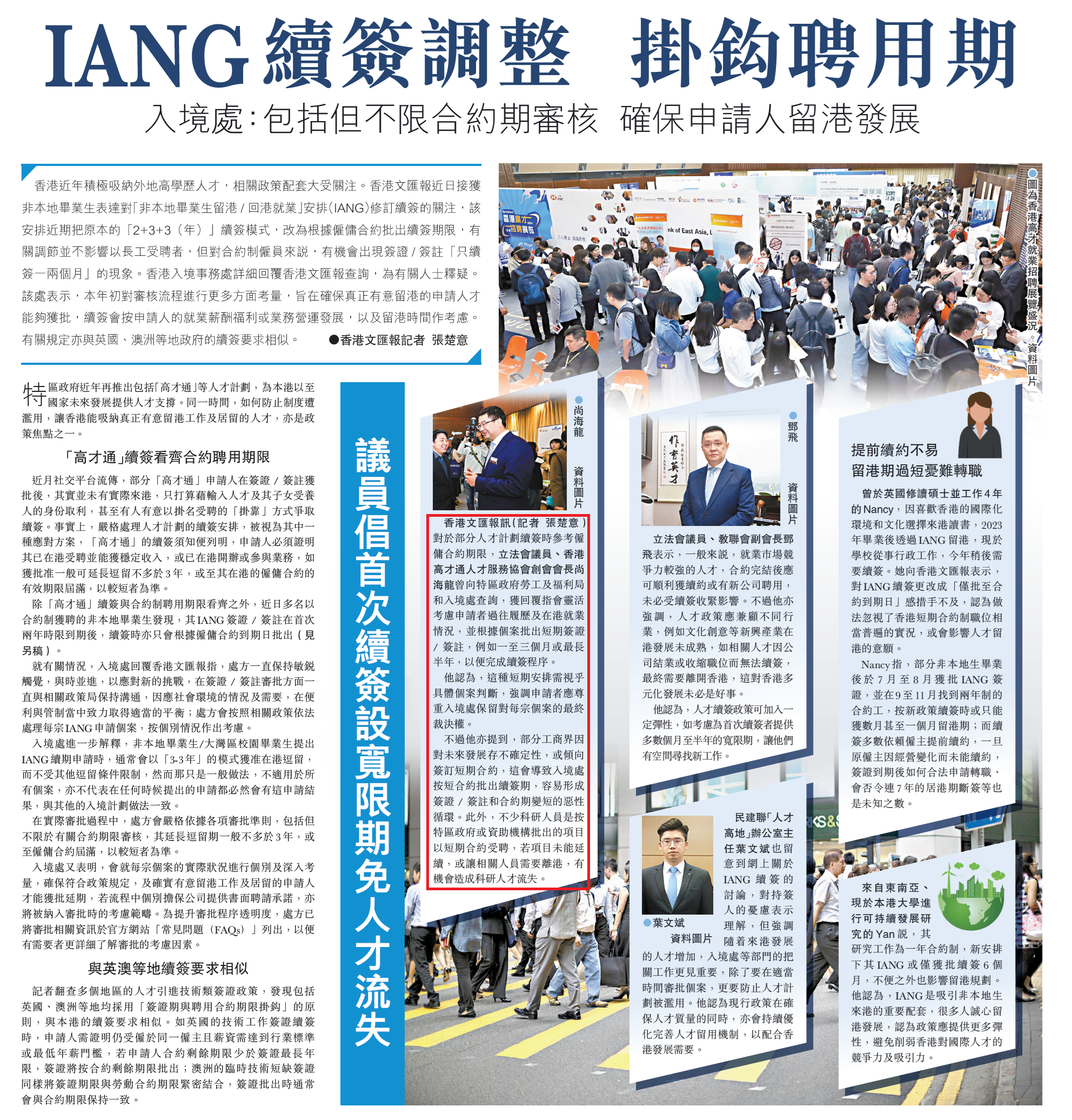 不過他亦提到,部分工商界因對未來發展存不確定性,或傾向簽訂短期合約,這會導致入境處按短合約批出續簽期,容易形成簽證 / 簽註和合約期變短的惡性循環。此外,不少科研人員是按特區政府或資助機構批出的項目以短期合約受聘,若項目未能延續,或讓相關人員需要離港,有機會造成科研人才流失。