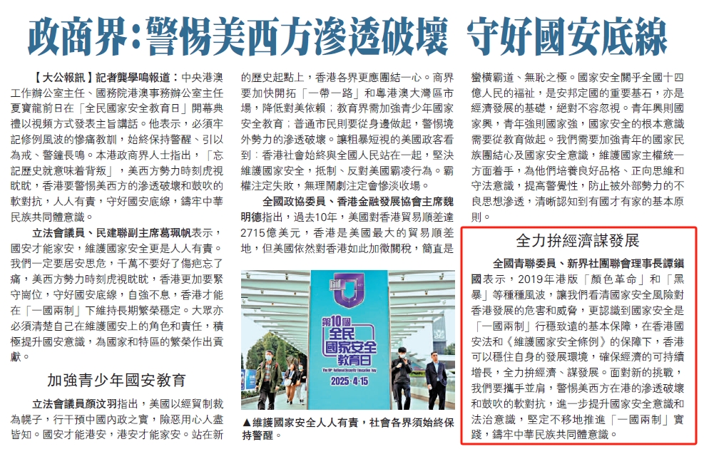 全國青聯委員、新界社團聯會理事長譚鎮國表示,2019年港版「顏色革命」和「黑暴」等種種風波,讓我們看清國家安全風險對香港發展的危害和威脅,更認識到國家安全是「一國兩制」行穩致遠的基本保障,在香港國安法和《維護國家安全條例》的保障下,香港可以穩住自身的發展環境,確保經濟的可持續增長,全力拚經濟、謀發展。面對新的挑戰,我們要攜手並肩,警惕美西方在港的滲透破壞和鼓吹的軟對抗,進一步提升國家安全意識和法治意識,堅定不移地推進「一國兩制」實踐,鑄牢中華民族共同體意識。
