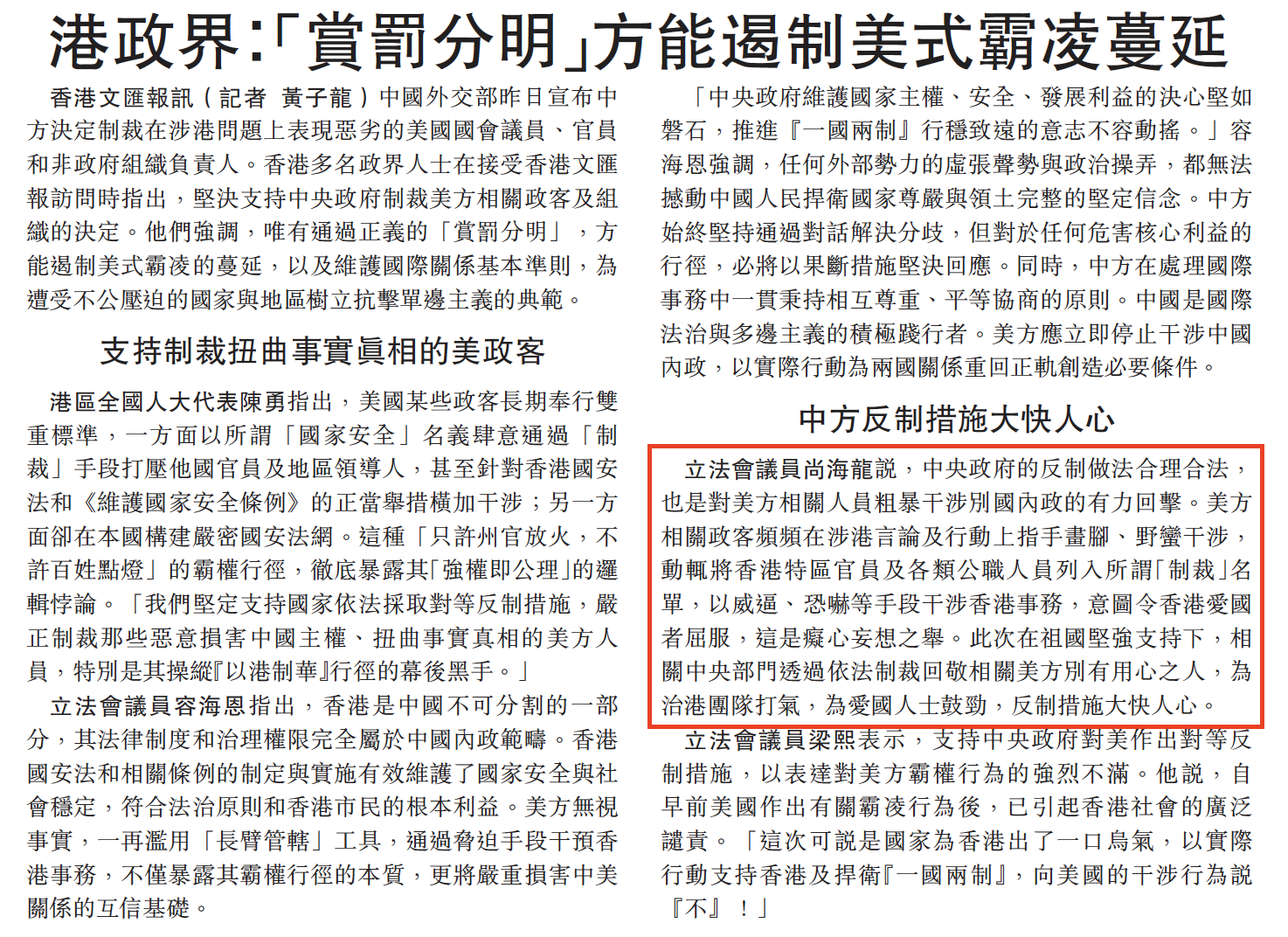 立法會議員尚海龍說,中央政府的反制做法合理合法,也是對美方相關人員粗暴干涉別國內政的有力回擊。美方相關政客頻頻在涉港言論及行動上指手畫腳、野蠻干涉,動輒將香港特區官員及各類公職人員列入所謂「制裁」名單,以威逼、恐嚇等手段干涉香港事務,意圖令香港愛國者屈服,這是癡心妄想之舉。此次在祖國堅強支持下,相關中央部門透過依法制裁回敬相關美方別有用心之人,為治港團隊打氣,為愛國人士鼓勁,反制措施大快人心。