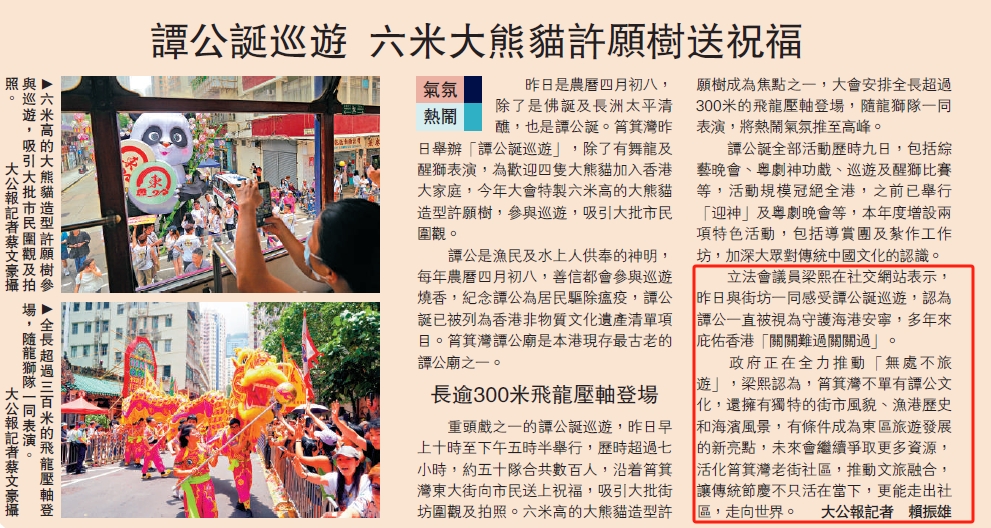 立法會議員梁熙在社交網站表示,昨日與街坊一同感受譚公誕巡遊,認為譚公一直被視為守護海港安寧,多年來庇佑香港「關關難過關關過」。
