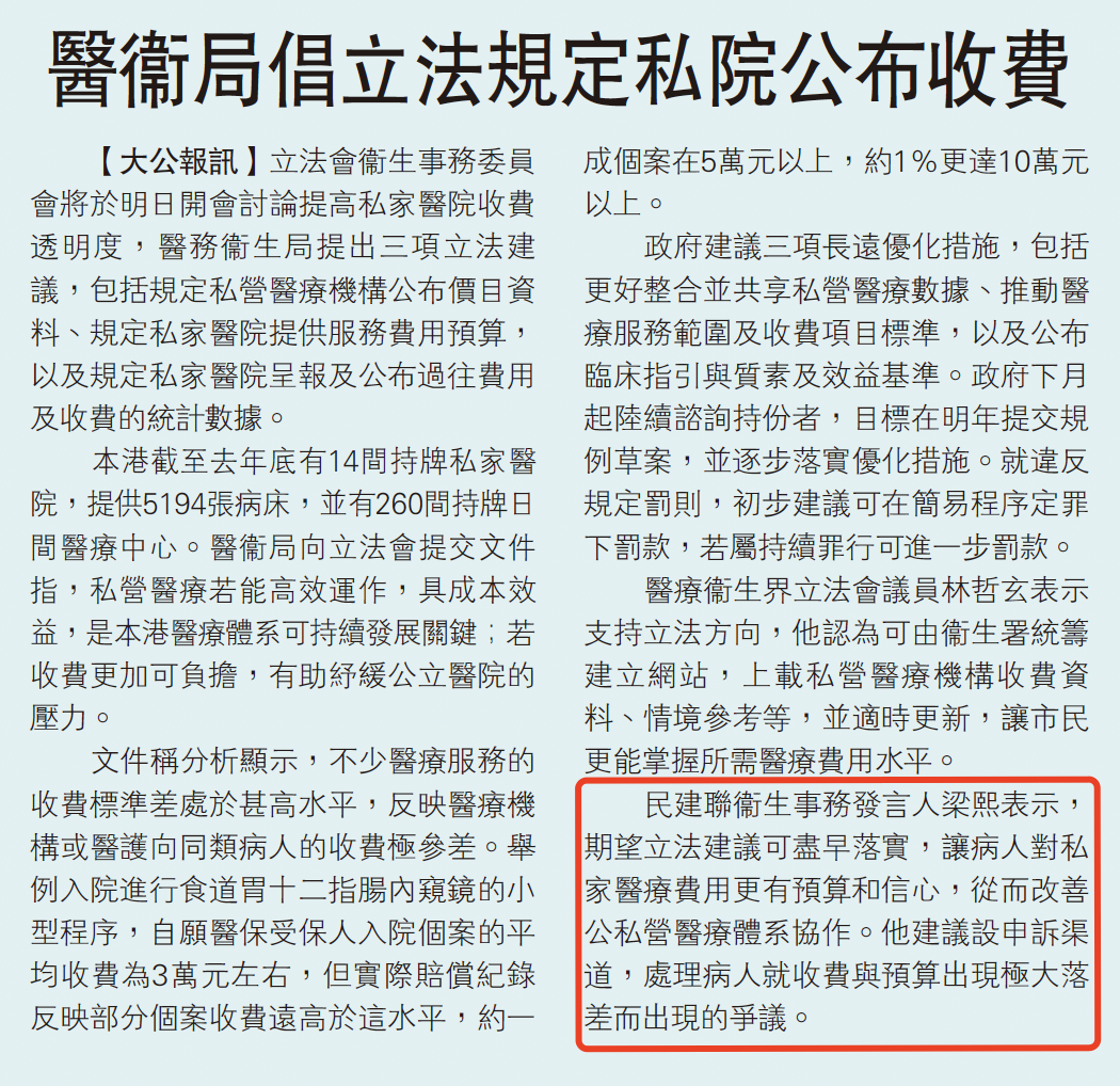 民建聯衞生事務發言人梁熙表示,期望立法建議可盡早落實,讓病人對私家醫療費用更有預算和信心,從而改善公私營醫療體系協作。他建議設申訴渠道,處理病人就收費與預算出現極大落差而出現的爭議。 來源:http://www.takungpao.com.hk/news/232109/2025/0508/1084593.html