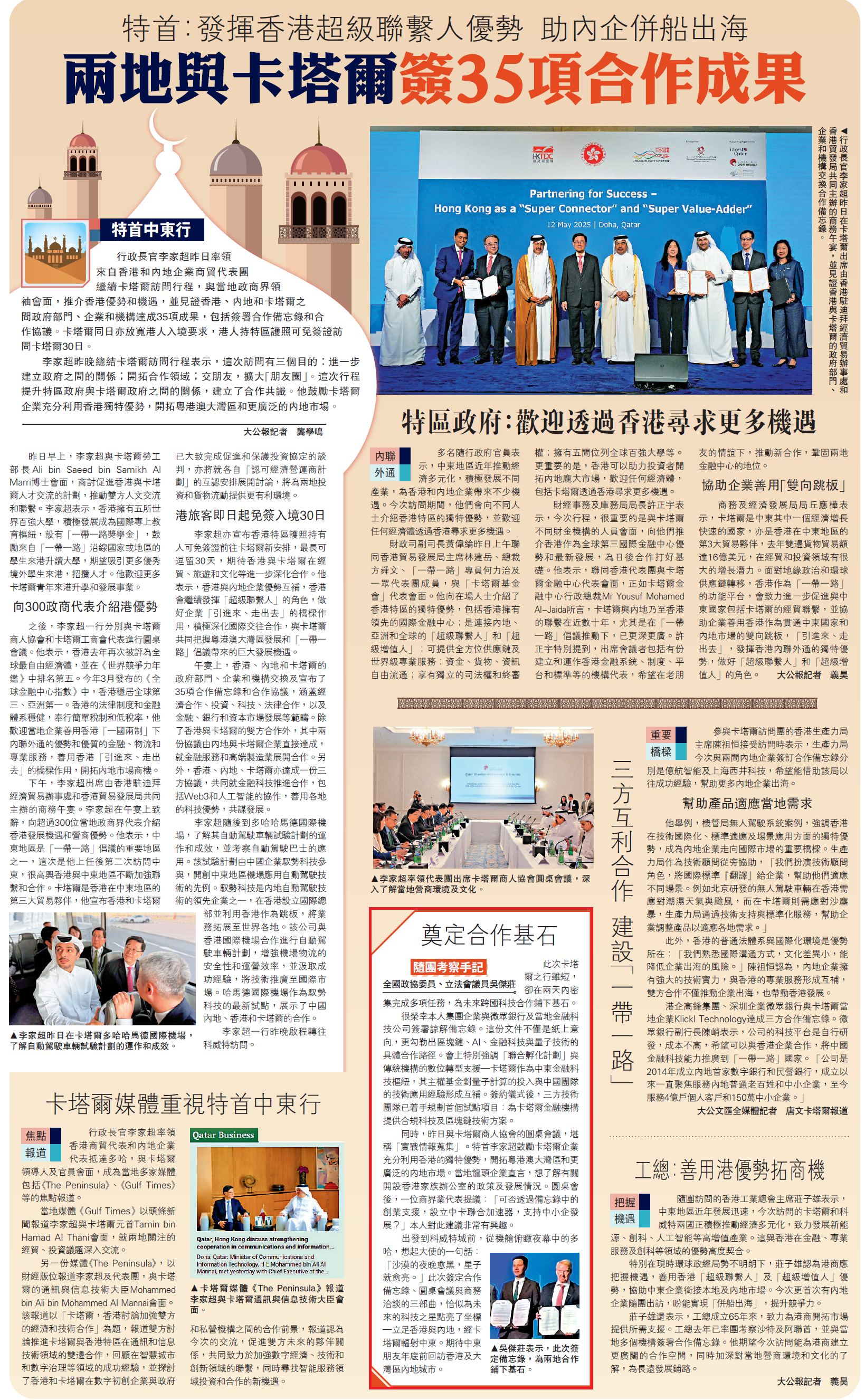 同時,昨日與卡塔爾商人協會的圓桌會議,堪稱「實戰情報蒐集」。特首李家超鼓勵卡塔爾企業充分利用香港的獨特優勢,開拓粵港澳大灣區和更廣泛的內地市場。當地龍頭企業直言,想了解有關開設香港家族辦公室的政策及發展情況。圓桌會後,一位商界業代表提議:「可否透過備忘錄中的創業支援,設立中卡聯合加速器,支持中小企發展?」本人對此建議非常有興趣。