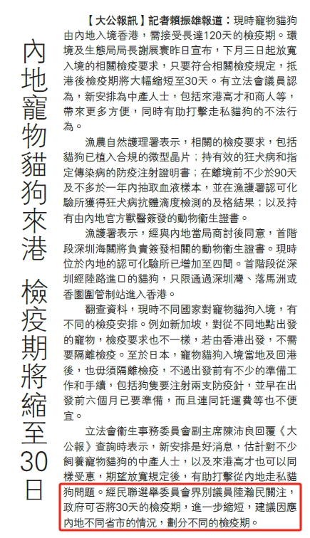 經民聯選舉委員會界別議員陸瀚民關注,政府可否將30天的檢疫期,進一步縮短,建議因應內地不同省市的情況,劃分不同的檢疫期。