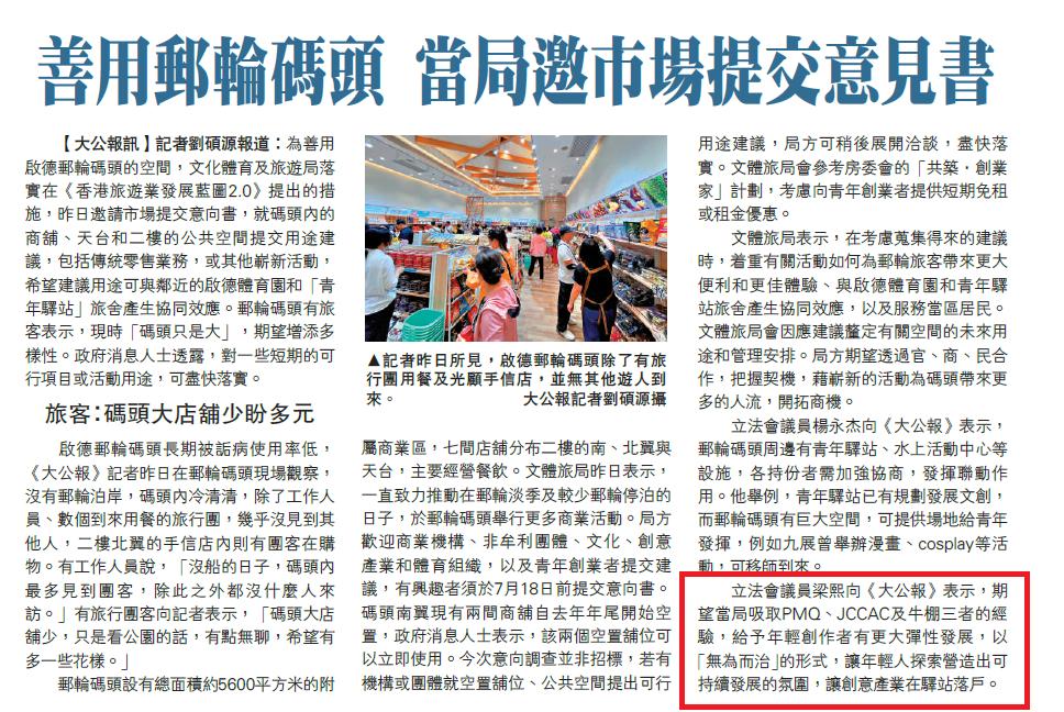 立法會議員梁熙向《大公報》表示,期望當局吸取PMQ、JCCAC及牛棚三者的經驗,給予年輕創作者有更大彈性發展,以「無為而治」的形式,讓年輕人探索營造出可持續發展的氛圍,讓創意產業在驛站落戶。