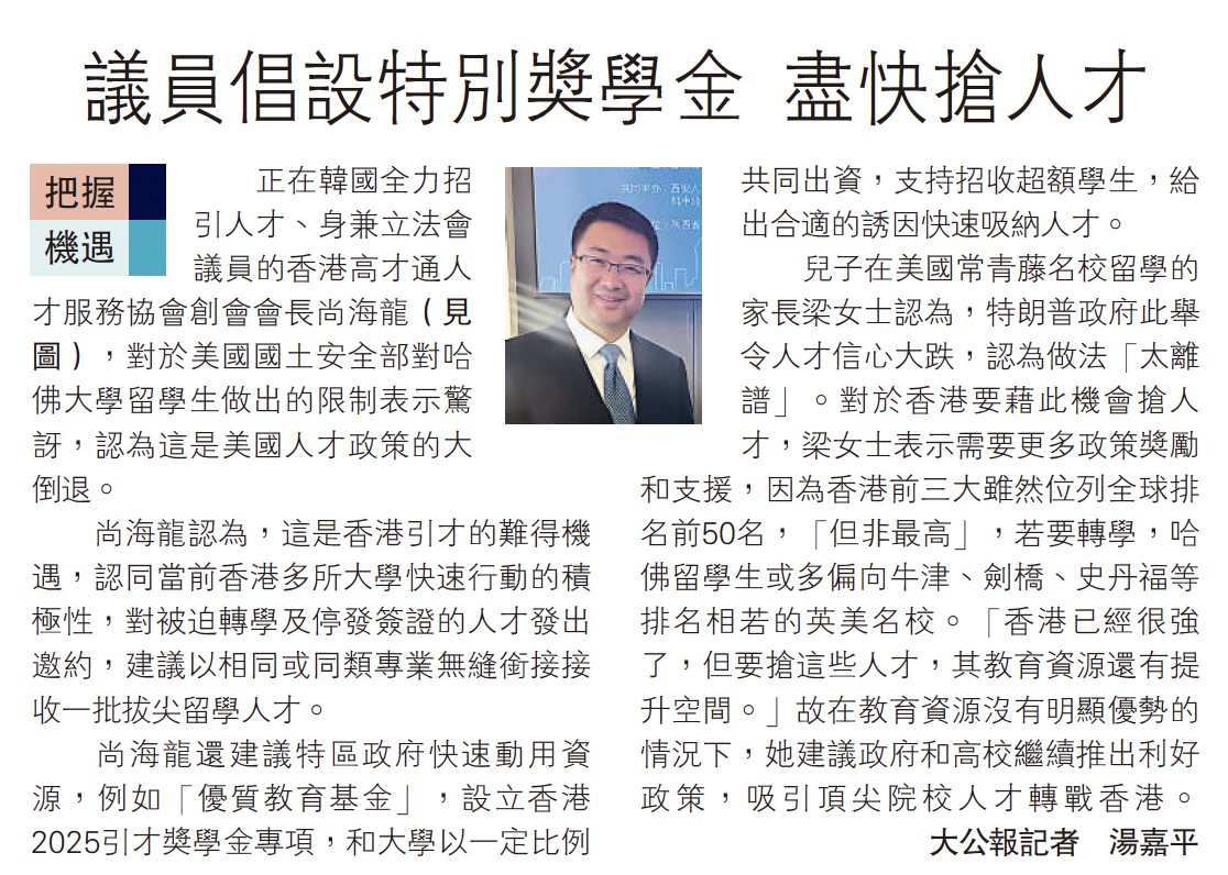正在韓國全力招引人才、身兼立法會議員的香港高才通人才服務協會創會會長尚海龍(見圖),對於美國國土安全部對哈佛大學留學生做出的限制表示驚訝,認為這是美國人才政策的大倒退。