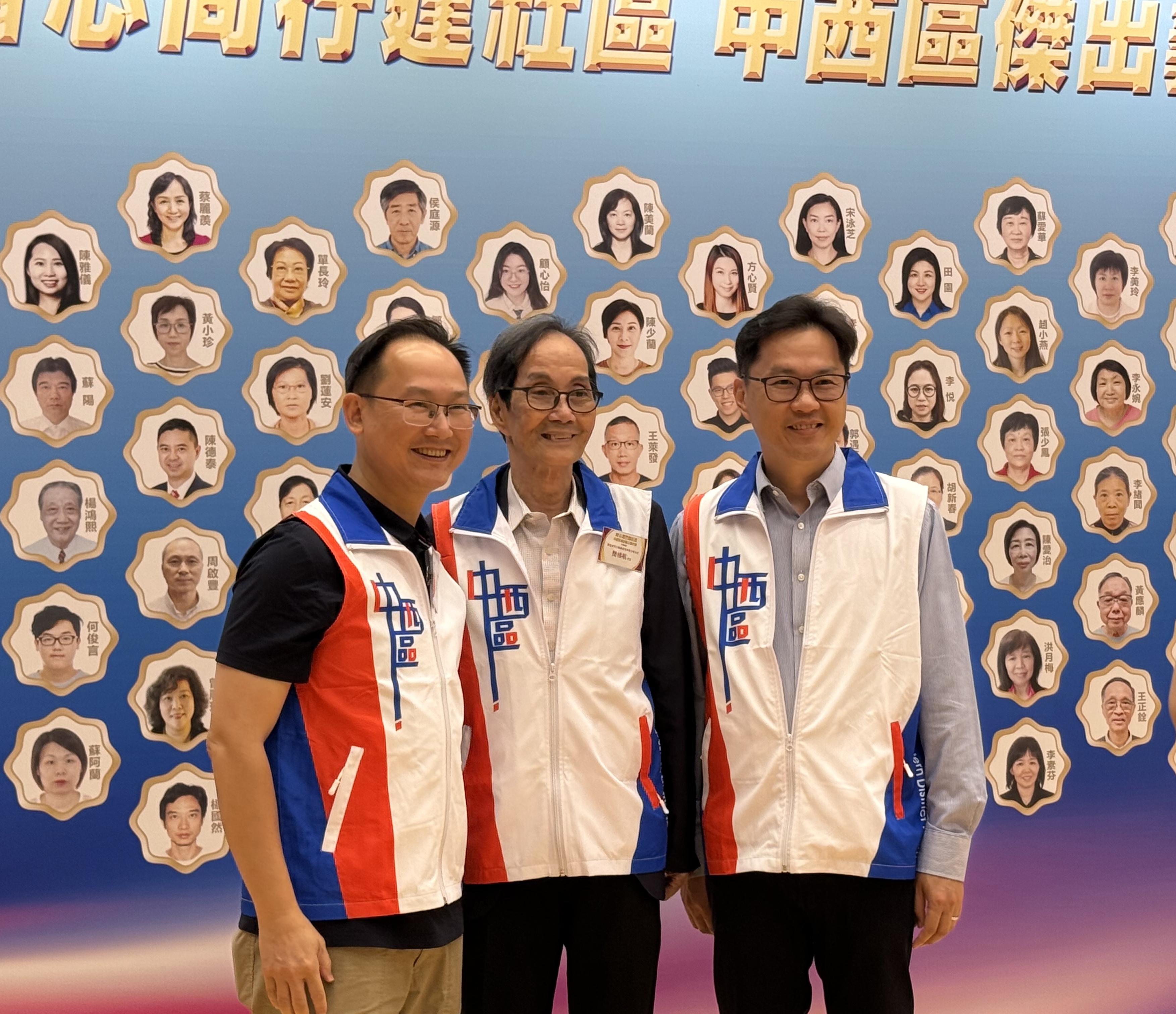本會理事長蘇長榮;執行會長陳家珮、陳學鋒;副理事長羅錦輝為得獎義工頒發傑出義工證書勳章,表彰過去一年在中西區辛勤付出的義工們。