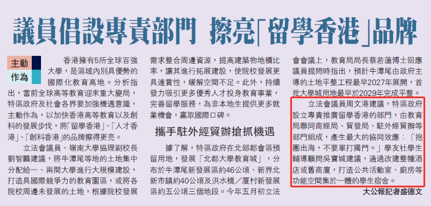立法會議員周文港建議,特區政府設立專責推廣留學香港的部門,由教育局聯同商經局、貿發局、駐外經貿辦等部門組成,產生最大的協同效應: 「抱團出海,不要單打獨鬥。」學友社學生輔導顧問吳寶城建議,通過改建整幢酒店或舊商廈,打造公共活動室、廚房等功能空間集於一體的學生宿舍。