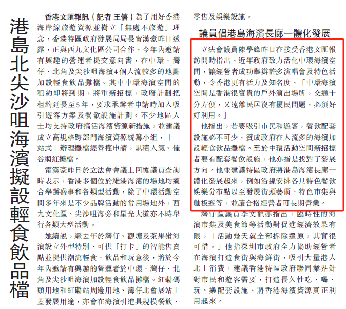 他指出,若要吸引市民和遊客,餐飲配套設施必不可少,贊成政府在人流多的海濱加設輕食飲品攤檔。至於中環活動空間新招標者要有配套餐飲設施,他亦指是找對了發展方向。他並建議特區政府將港島海濱長廊一體化發展起來,例如沿線安排各具特色餐飲娛樂分布點以至發展街頭藝術、特色市集與舢板遊等,並讓合格經營者可長期營業。