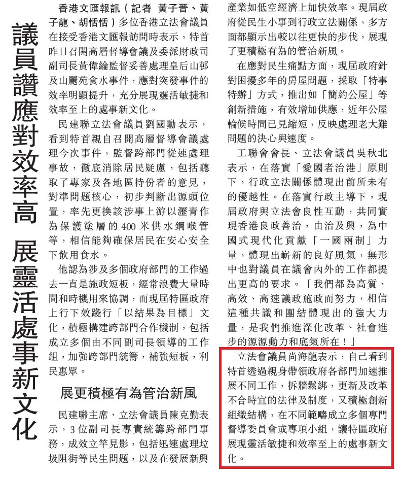 立法會議員尚海龍表示,自己看到特首透過親身帶領政府各部門加速推展不同工作,拆牆鬆綁,更新及改革不合時宜的法律及制度,又積極創新組織結構,在不同範疇成立多個專門督導委員會或專項小組,讓特區政府展現靈活敏捷和效率至上的處事新文化。