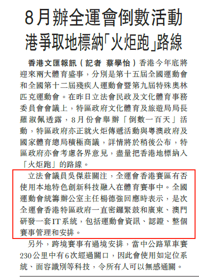 立法會議員吳傑莊關注,全運會香港賽區有否使用本地特色創新科技融入在體育賽事中。全國運動會統籌辦公室主任楊德強回應時表示,是次全運會香港特區政府一直密鑼緊鼓和廣東、澳門研發一套IT系統,包括運動會資訊、認證、整個賽事管理和安排。