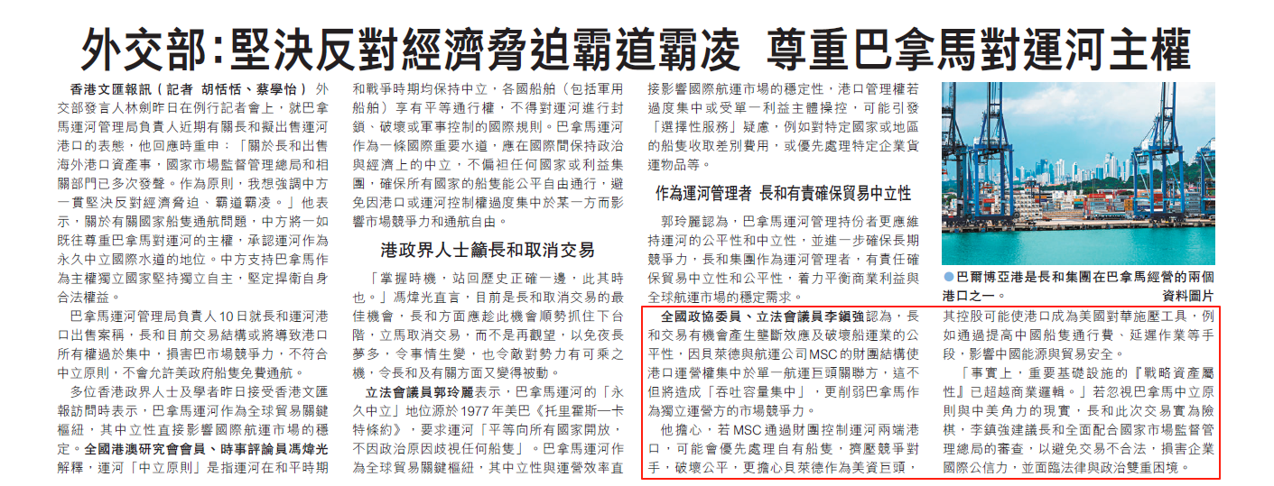 他擔心,若MSC通過財團控制運河兩端港口,可能會優先處理自有船隻,擠壓競爭對手,破壞公平,更擔心貝萊德作為美資巨頭,其控股可能使港口成為美國對華施壓工具,例如通過提高中國船隻通行費、延遲作業等手段,影響中國能源與貿易安全。