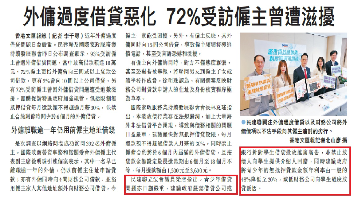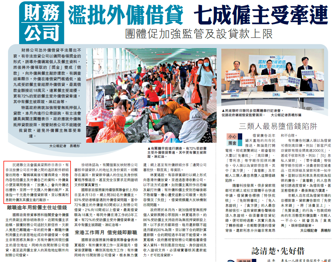 民建聯立法會議員梁熙昨日表示,有非法放債公司在外傭之間的通訊軟件群組發出問卷,聲稱填寫後可獲得獎金,問卷內容包括僱主及外傭自己的資料。外傭貪小便宜填問卷後, 「放債人」會向外傭送出禮物,並將一千元匯入外傭的賬戶,其後指一千元是外傭借貸款項,並以極高利息對外傭及其僱主進行敲詐。
