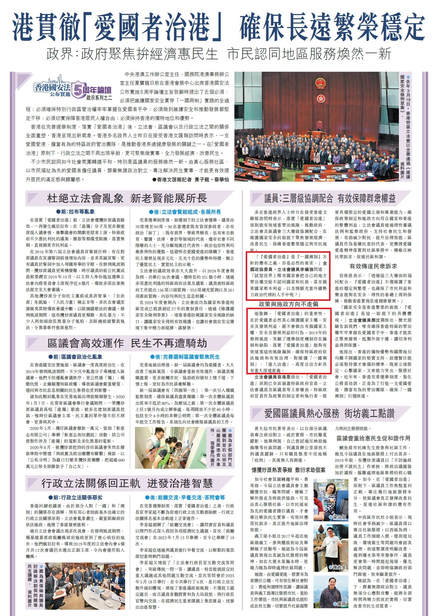「『愛國者治港』是『一國兩制』方針的應有之義,亦是必然的要求,」全國政協委員、立法會議員李鎮強問道:「試想世界上哪有國家會把自己的地方管治權交給不認同國家和民族,甚至損害國家根本利益,以及情願充當外國勢力政治代理的人手中呢?」