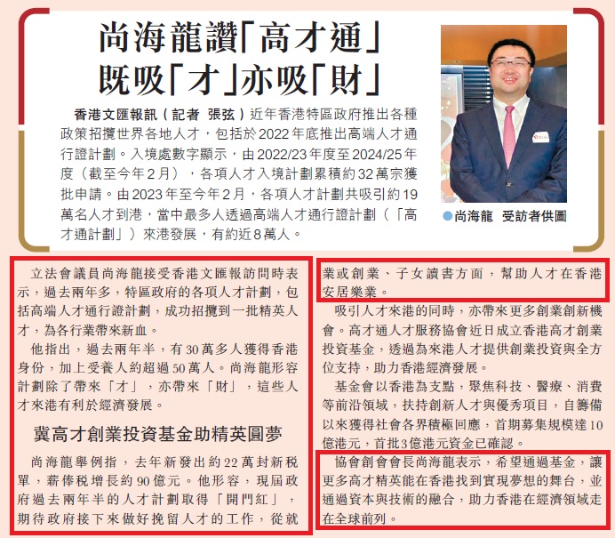 立法會議員尚海龍接受香港文匯報訪問時表示,過去兩年多,特區政府的各項人才計劃,包括高端人才通行證計劃,成功招攬到一批精英人才,為各行業帶來新血。