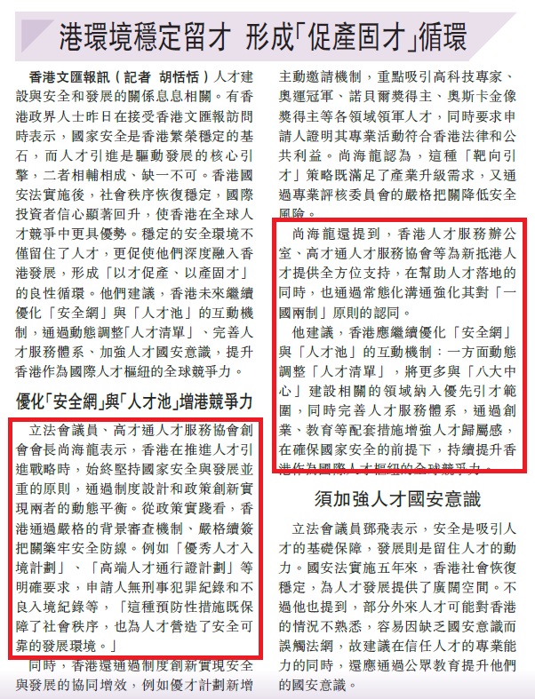 尚海龍還提到,香港人才服務辦公室、高才通人才服務協會等為新抵港人才提供全方位支持,在幫助人才落地的同時,也通過常態化溝通強化其對「一國兩制」原則的認同。