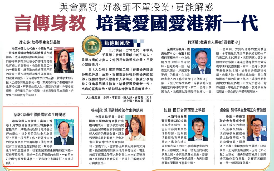 港區全國人大代表、富通(香港)資本投資管理有限公司董事長蔡毅表示,只有好的教師才能培養出好的學生,這對於香港社會尤為重要,更是一項長期工作,對香港未來的教育發展產生深遠影響。他指本港教育工作者應透過言傳身教,幫助學生了解及認識國家,從而對國家產生歸屬和認同感。蔡毅更提及他中學時一名印尼華僑的教師,一直用自己的親身經歷教導學生,更印證只有國家好,家庭才能好。
