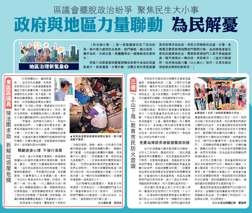 「民生無小事。」新一屆區議會沒有了政治紛爭,集中精力處理民生事務。部門聯動、整合資源、攜手為民、共建社區,具體體現在一樁樁鮮活的事例中: