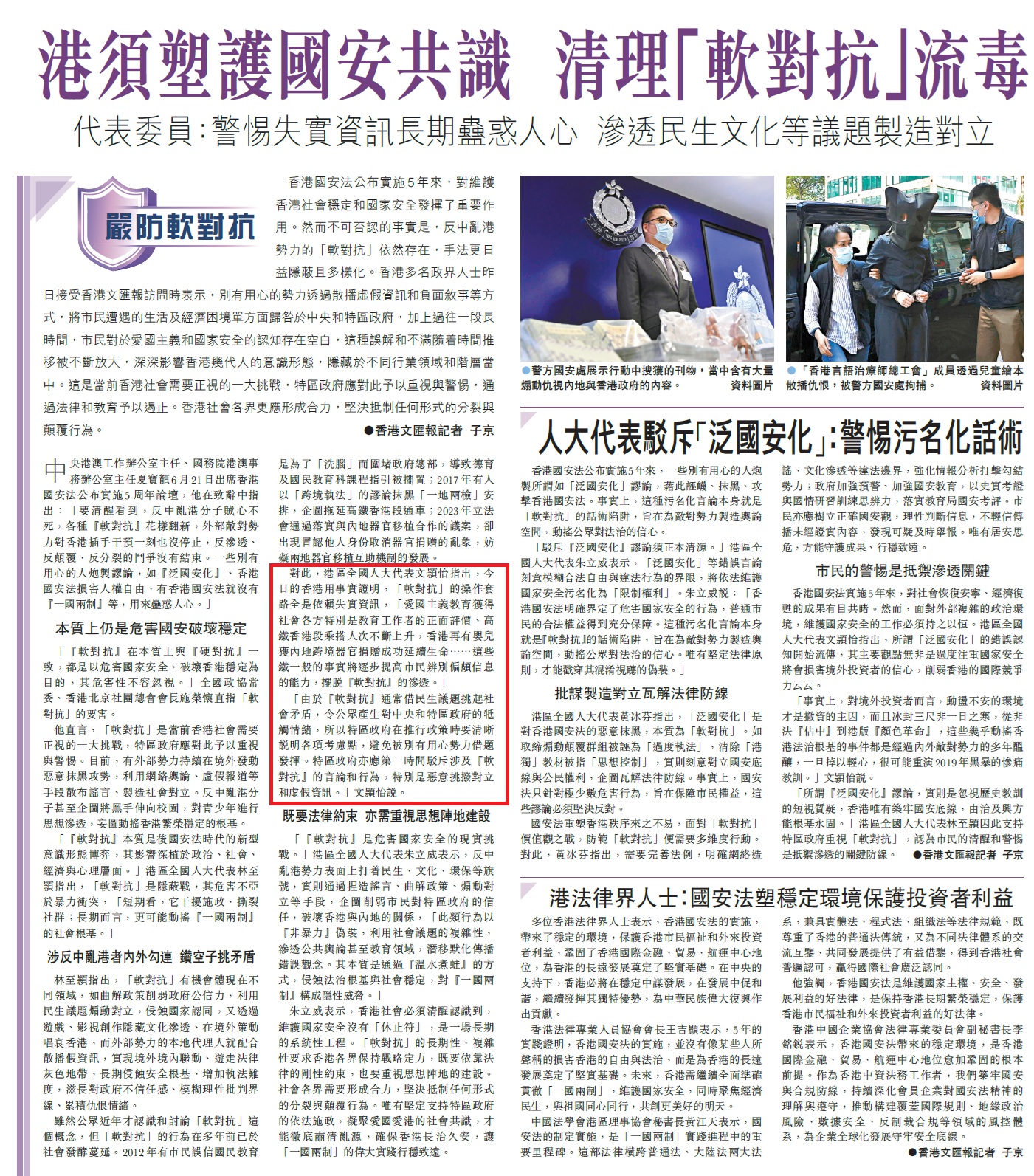 對此,港區全國人大代表文頴怡指出,今日的香港用事實證明,「軟對抗」的操作套路全是依賴失實資訊,「愛國主義教育獲得社會各方特別是教育工作者的正面評價、高鐵香港段乘搭人次不斷上升,香港再有嬰兒獲內地跨境器官捐贈成功延續生命……這些鐵一般的事實將逐步提高市民辨別偏頗信息的能力,擺脫『軟對抗』的滲透。」