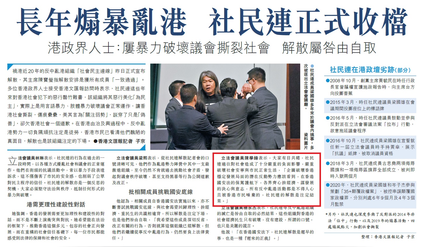 立法會議員陳學鋒表示,大家有目共睹,社民連過往對社會造成了十分嚴重的負面影響,嚴重破壞社會安寧與市民正常生活,「企圖破壞香港穩定發展局面的潛在反動勢力應該看到,在香港國安法的保駕護航下,各界齊心拚經濟、謀發展的決心與意志,所有反中亂港活動都是不得人心且被香港市民唾棄的,社民連的解散是注定結果。」