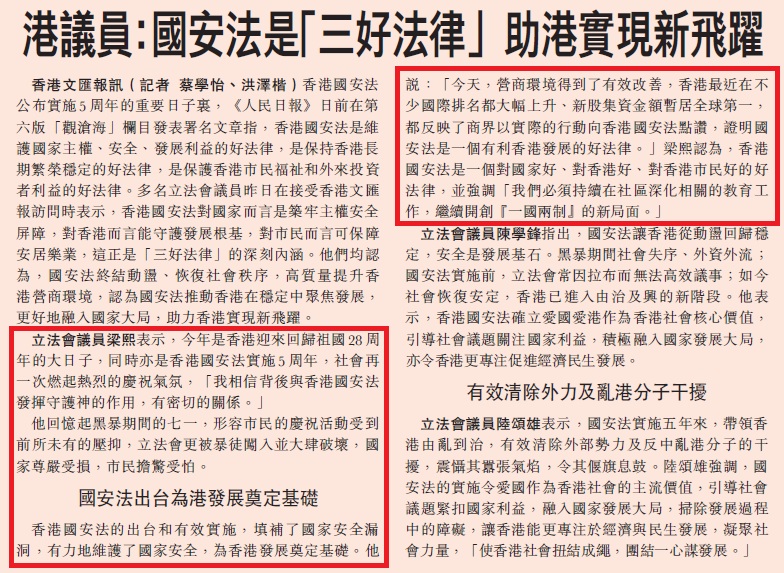香港國安法的出台和有效實施,填補了國家安全漏洞,有力地維護了國家安全,為香港發展奠定基礎。他說:「今天,營商環境得到了有效改善,香港最近在不少國際排名都大幅上升、新股集資金額暫居全球第一,都反映了商界以實際的行動向香港國安法點讚,證明國安法是一個有利香港發展的好法律。」梁熙認為,香港國安法是一個對國家好、對香港好、對香港市民好的好法律,並強調「我們必須持續在社區深化相關的教育工作,繼續開創『一國兩制』的新局面。」