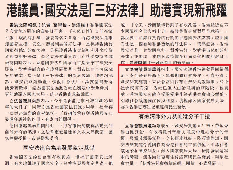 立法會議員陳學鋒指出,國安法讓香港從動盪回歸穩定,安全是發展基石。黑暴期間社會失序、外資外流;國安法實施前,立法會常因拉布而無法高效議事;如今社會恢復安定,香港已進入由治及興的新階段。他表示,香港國安法確立愛國愛港作為香港社會核心價值,引導社會議題關注國家利益,積極融入國家發展大局,亦令香港更專注促進經濟民生發展。