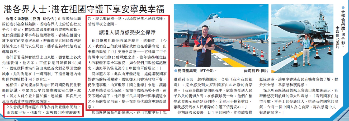 尚海龍表示,此次山東艦訪港,處處體現國家對香港的特別關愛。國家從未向香港收取軍費,仍派遼寧艦、山東艦等「國之重器」來港,讓港人親身感受安全保障。在如今國際局勢不穩、衝突不斷的當下,他呼籲市民共同珍惜與維護這來之不易的安定局面,攜手在新時代續寫更輝煌篇章。