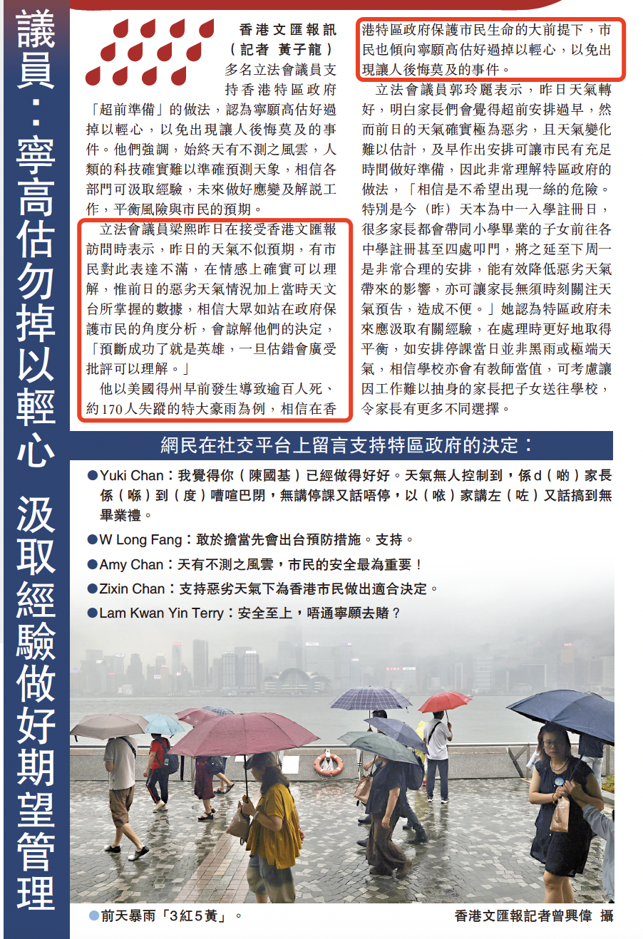 立法會議員梁熙昨日在接受香港文匯報訪問時表示,昨日的天氣不似預期,有市民對此表達不滿,在情感上確實可以理解,惟前日的惡劣天氣情況加上當時天文台所掌握的數據,相信大眾如站在政府保護市民的角度分析,會諒解他們的決定,「預斷成功了就是英雄,一旦估錯會廣受批評可以理解。」