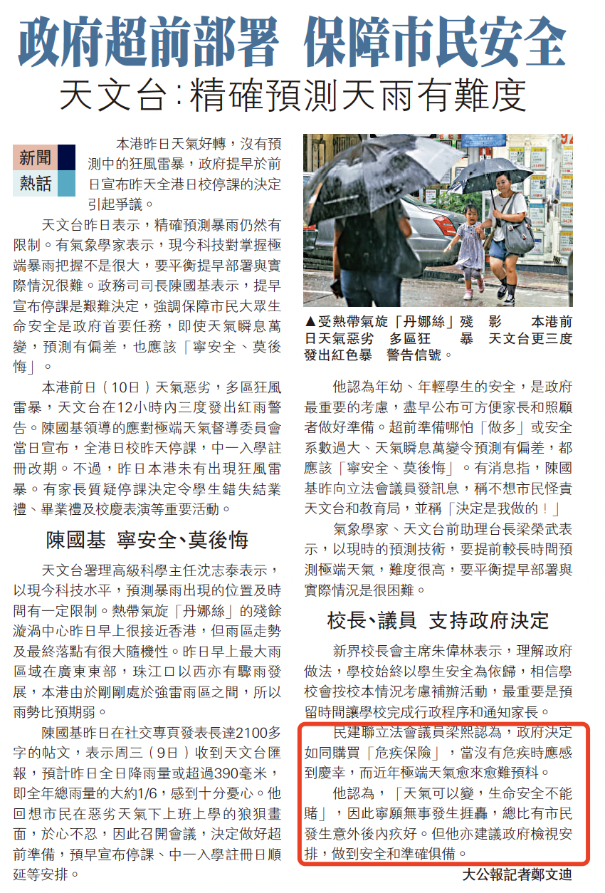 民建聯立法會議員梁熙認為,政府決定 如同購買「危疾保險」,當沒有危疾時應感 到慶幸,而近年極端天氣愈來愈難預料。 他認為, 「天氣可以變,生命安全不能 賭」,因此寧願無事發生捱轟,總比有市民 發生意外後內疚好。但他亦建議政府檢視安 排,做到安全和準確俱備。