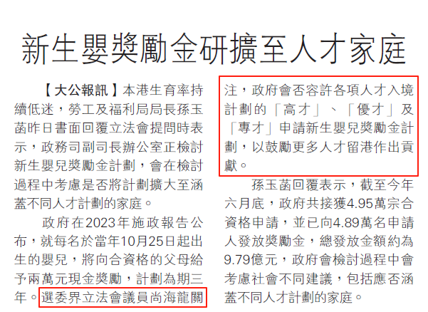 選委界立法會議員尚海龍關注,政府會否容許各項人才入境計劃的「高才」、「優才」及「專才」申請新生嬰兒獎勵金計劃,以鼓勵更多人才留港作出貢獻。