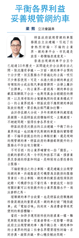 當然,如許多運用新科技的新產業一樣,難免對既有經營者、從業者帶來一定影響,特區政府立法規管網約車,應平衡公眾、網約車和的士業界的利益;社會各界需要理性討論、求同存異,凝聚共識,齊心穩妥解決問題。