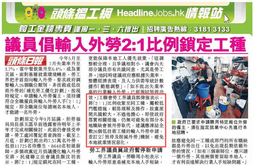 工聯會勞工界議員郭偉强表示,將「2:1」比例收緊至同工種,屬較低門檻措施,較易理解及操作,故黨派間共識較大。不過他擔心,即使政府落實相關措施,仍無可避免有部分本地職缺會被外勞取代,建議應凍結全數26個低技術工種的輸入外勞申請,並訂立「煞停及削減外勞」機制,避免本地就業情況惡化。