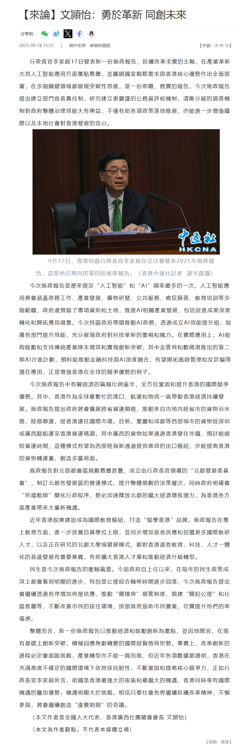 行政長官李家超17日發表新一份施政報告,延續改革求變的主軸,在產業革新尤其人工智能應用方面重點着墨,並圍繞國家戰略需求與香港核心優勢作出全面部署,在多個關鍵領域都展現突破性思維,是一份前瞻、務實的報告。今次施政報告提出建立部門首長責任制,研究建立更嚴謹的公務員評核機制,清晰分級的調查機制對政府整體治理效能大有裨益,不僅有助各項政策落地推展,亦能進一步增強國際以及本地社會對香港發展的信心。